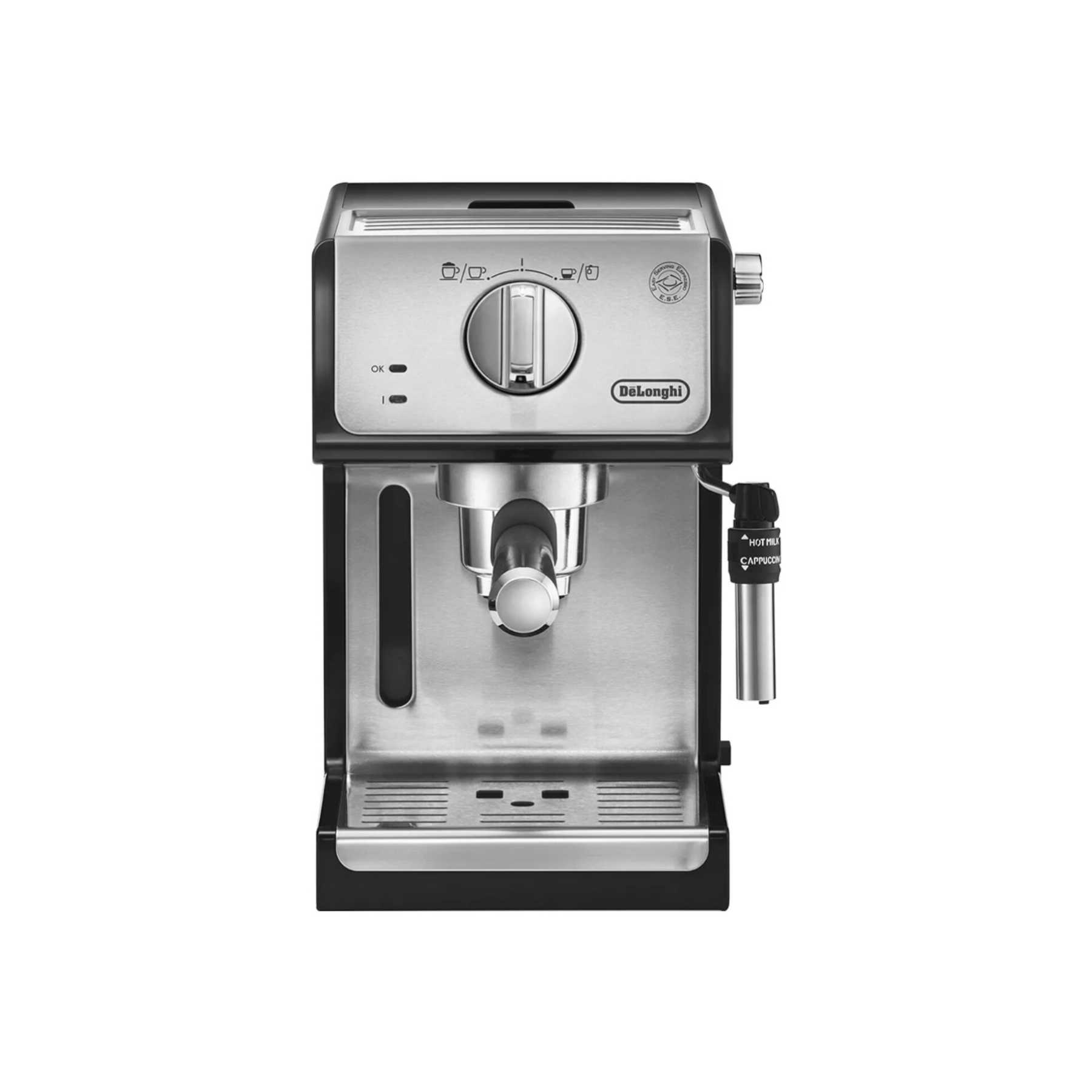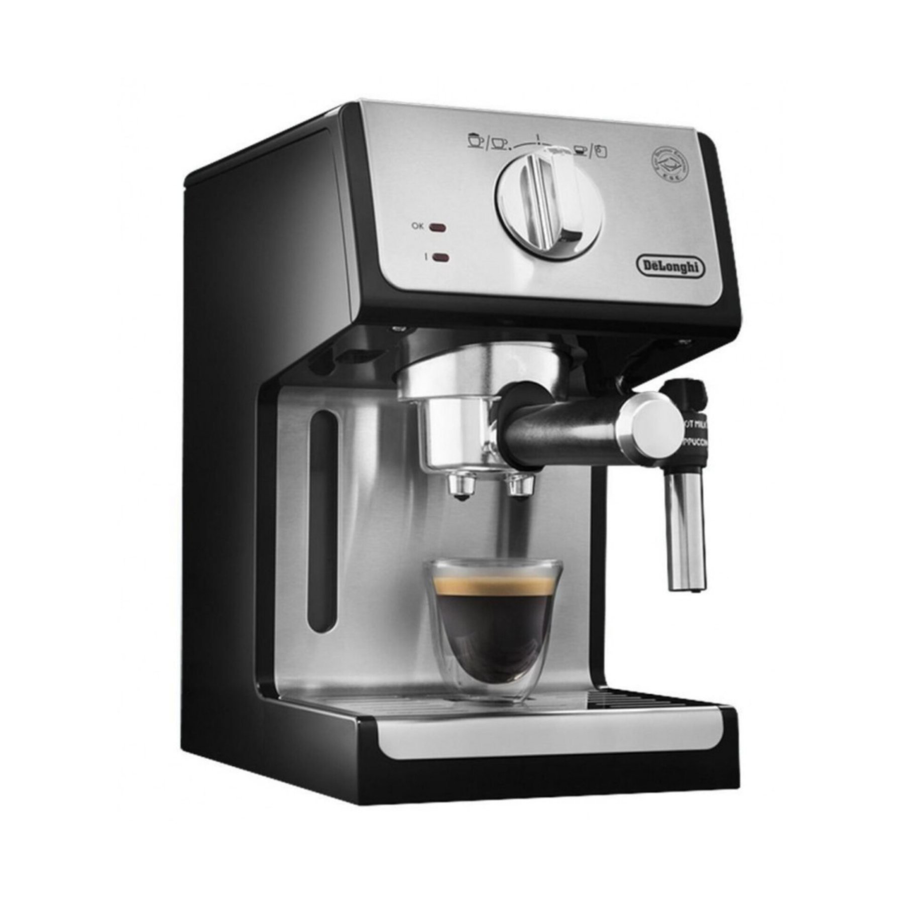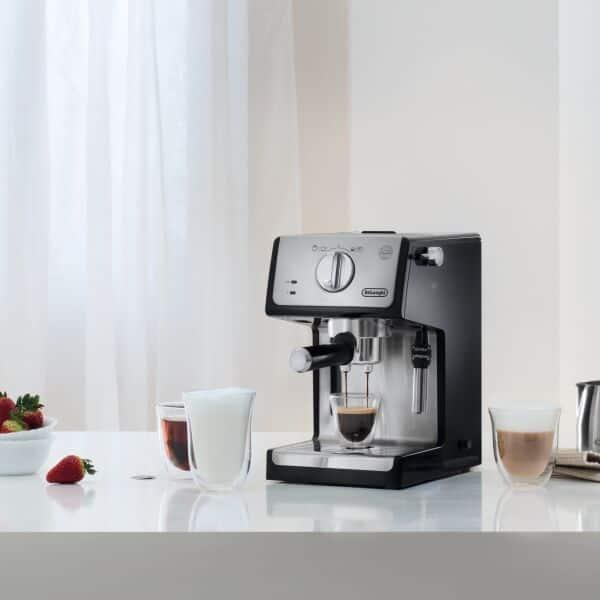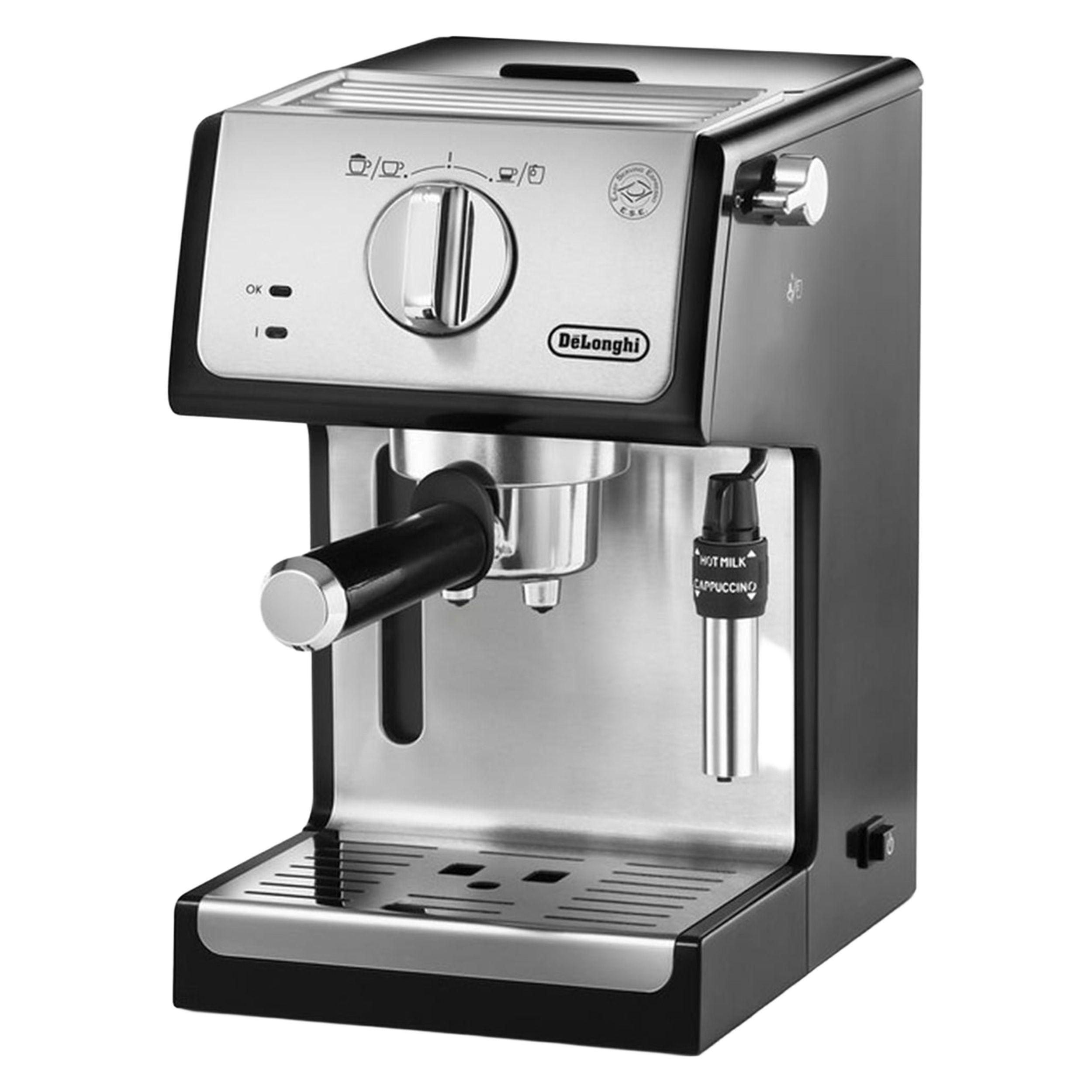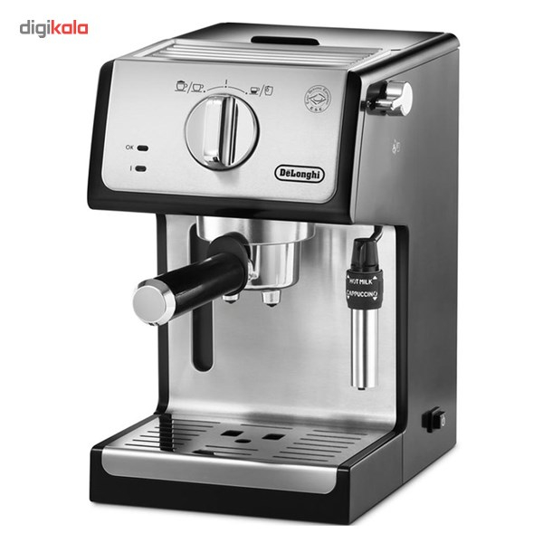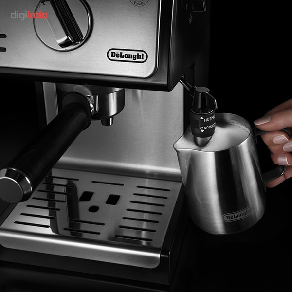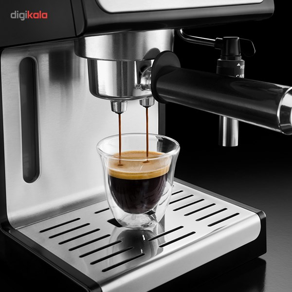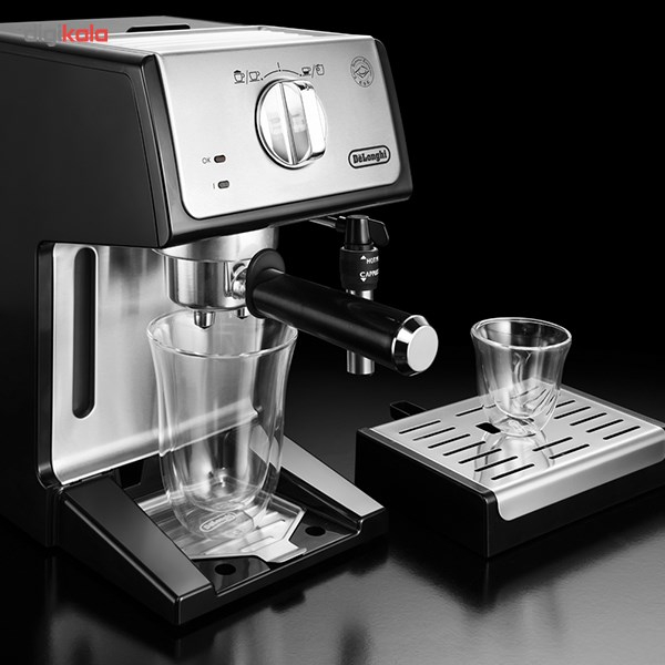 - سایر توضیحاتمخزن آب شفاف و جداشدنی / سیستم کف ساز قابل تنظیم: 2 حالت کف شیر ، کف شیر غلیظ و یا فقط شیر داغ / قابلیت استفاده قهوه پودر (برای یک و یا دو فنجان) وهمچنین پد قهوه (قهوه کیسهای) / کلیدهای مجزابرای حالت خاموش و روشن و انتخاب نوشیدنی اسپرسو و یا کاپوچینو به همراه چراغ نشانگر / 2 ترموستات مجزا به جهت کنترل دمای قسمت آب و بخار بصورت جداگانه / اهرم باز کردن و تنظیم بخار خروجی / محفظه جایگیری قطعات جانبی: شامل فیلتر برای یک فنجان قهوه، فیلتر برای دو فنجان قهوه و نیز فیلتر قهوه کیسهای