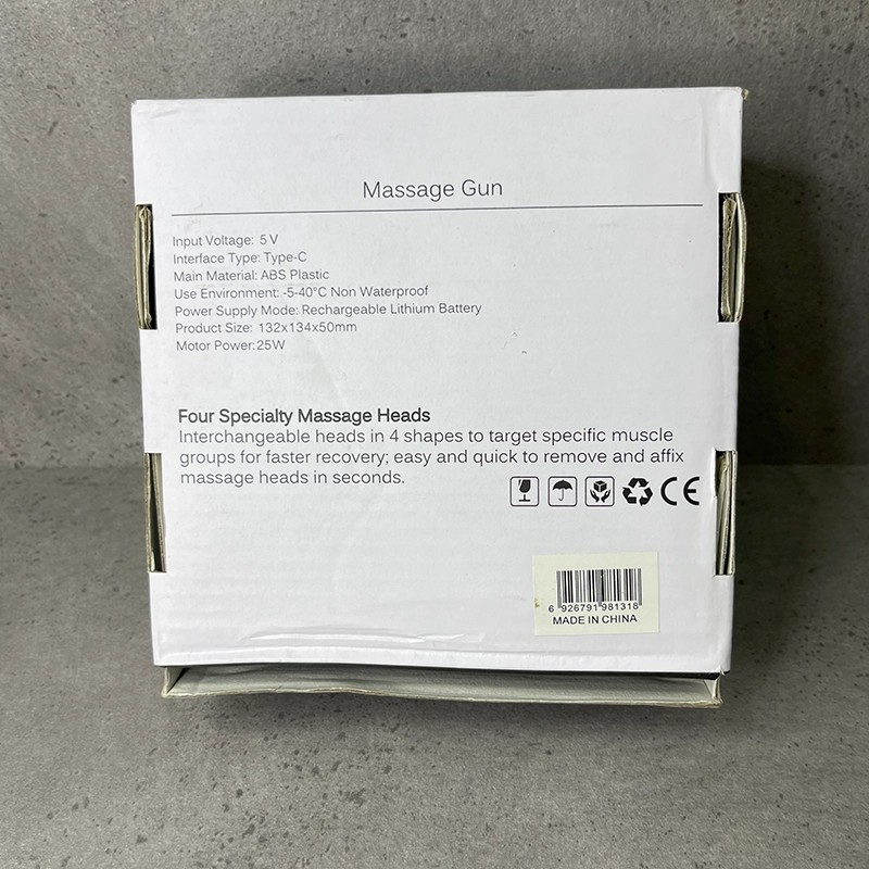 ماساژور تفنگی با طراحی ارگونومیک و بدنهای از جنس پلاستیک مقاوم ABS، دارای وزن 550 گرم و ابعاد 132×134×50 میلیمتر، مجهز به موتور قدرتمند با توان 25 وات و باتری لیتیومی قابل شارژ، ولتاژ ورودی 5 ولت با درگاه شارژ Type-C (تایپسی)، همراه با 4 سری قابل تعویض برای کاربردهای متنوع، مناسب برای تسکین عضلات، رفع خستگی و ماساژ نقاط مختلف بدن میباشد.