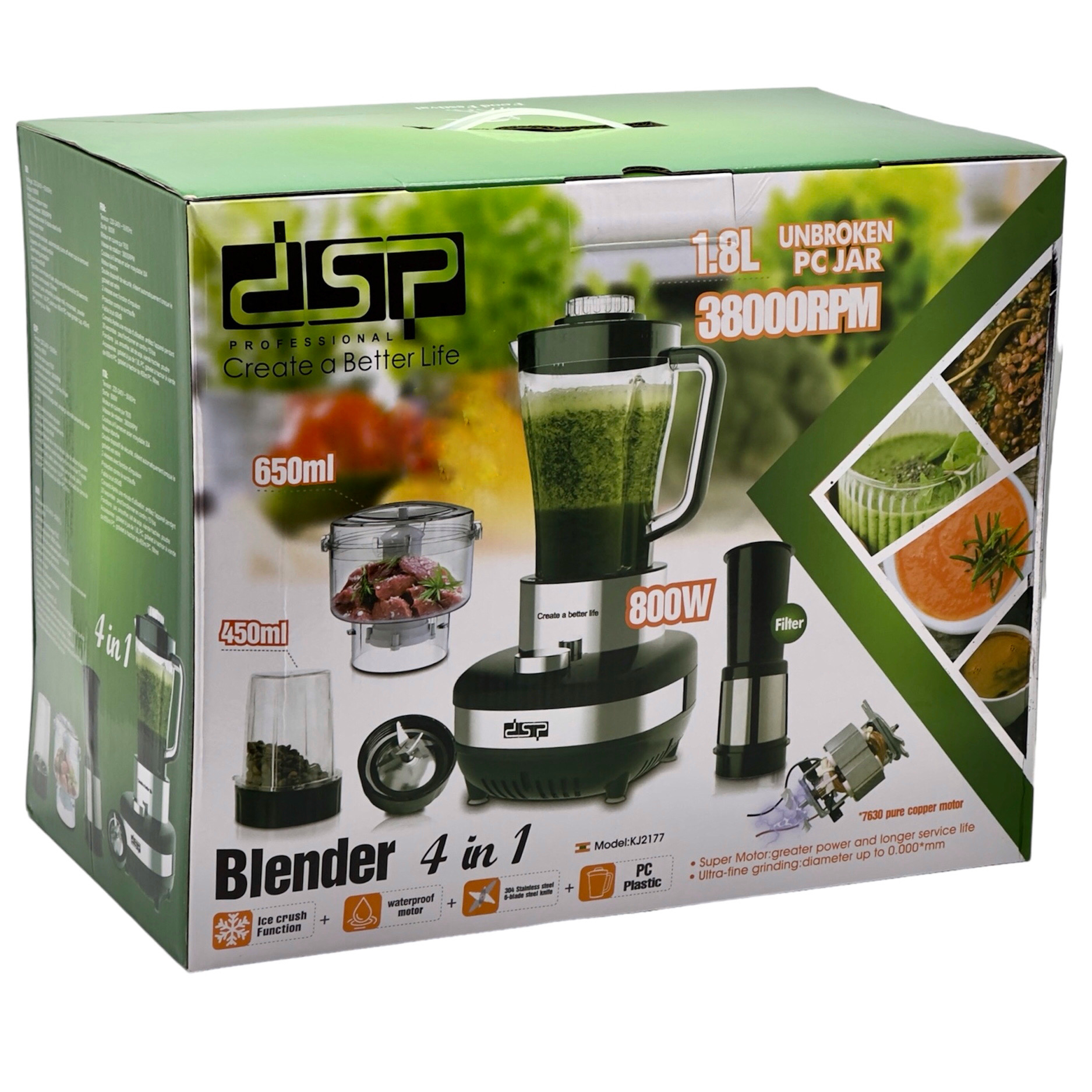 دارای موتور 7630 / 38000PRM سرعت / صدا زیر 90db 1.8 لیتر ظرفیت/ ظرفیت خردکن 650ml /ظرفیت اسیاب 450ml جنس پلاستیک نشکن با دوام بالا دارای موتور ضد اب