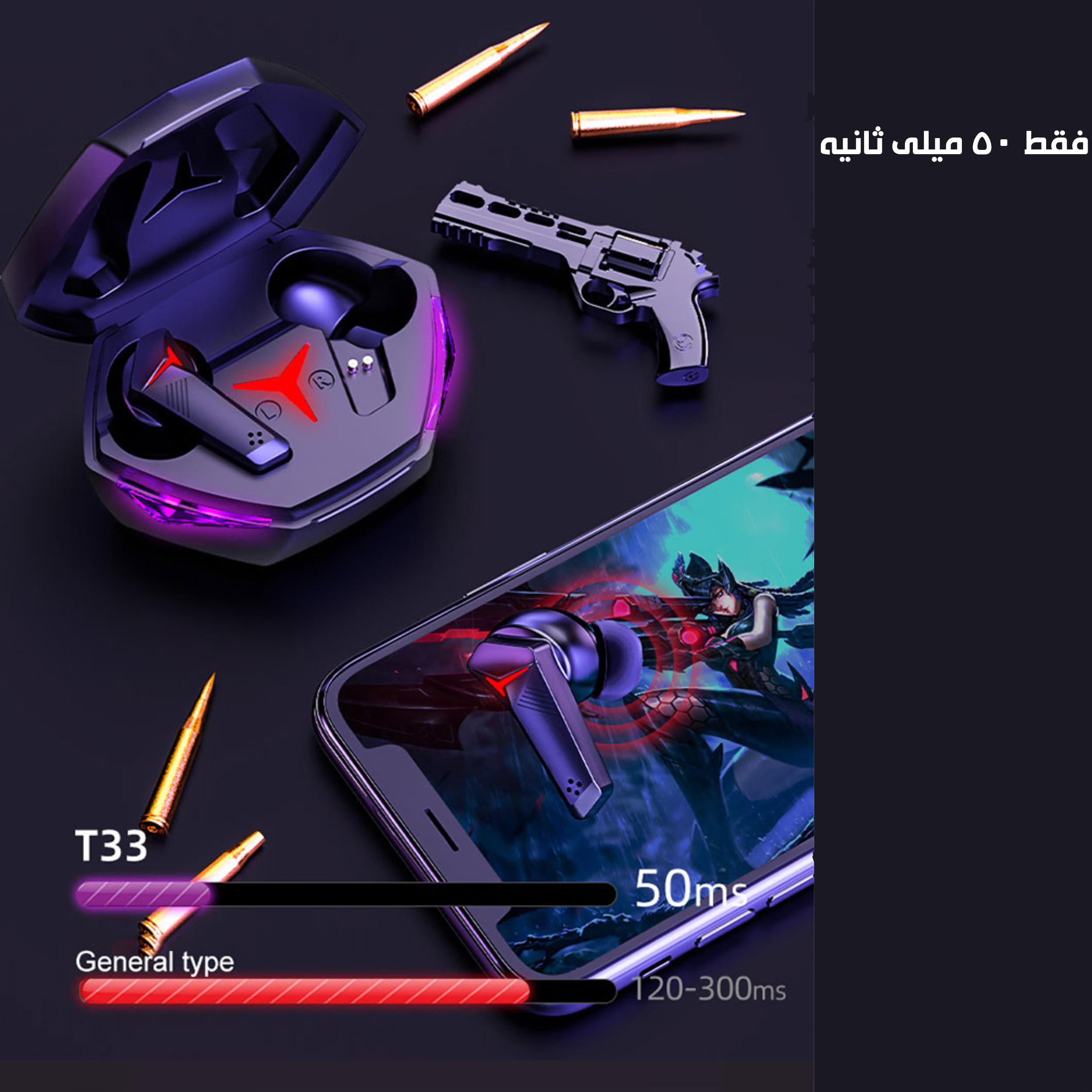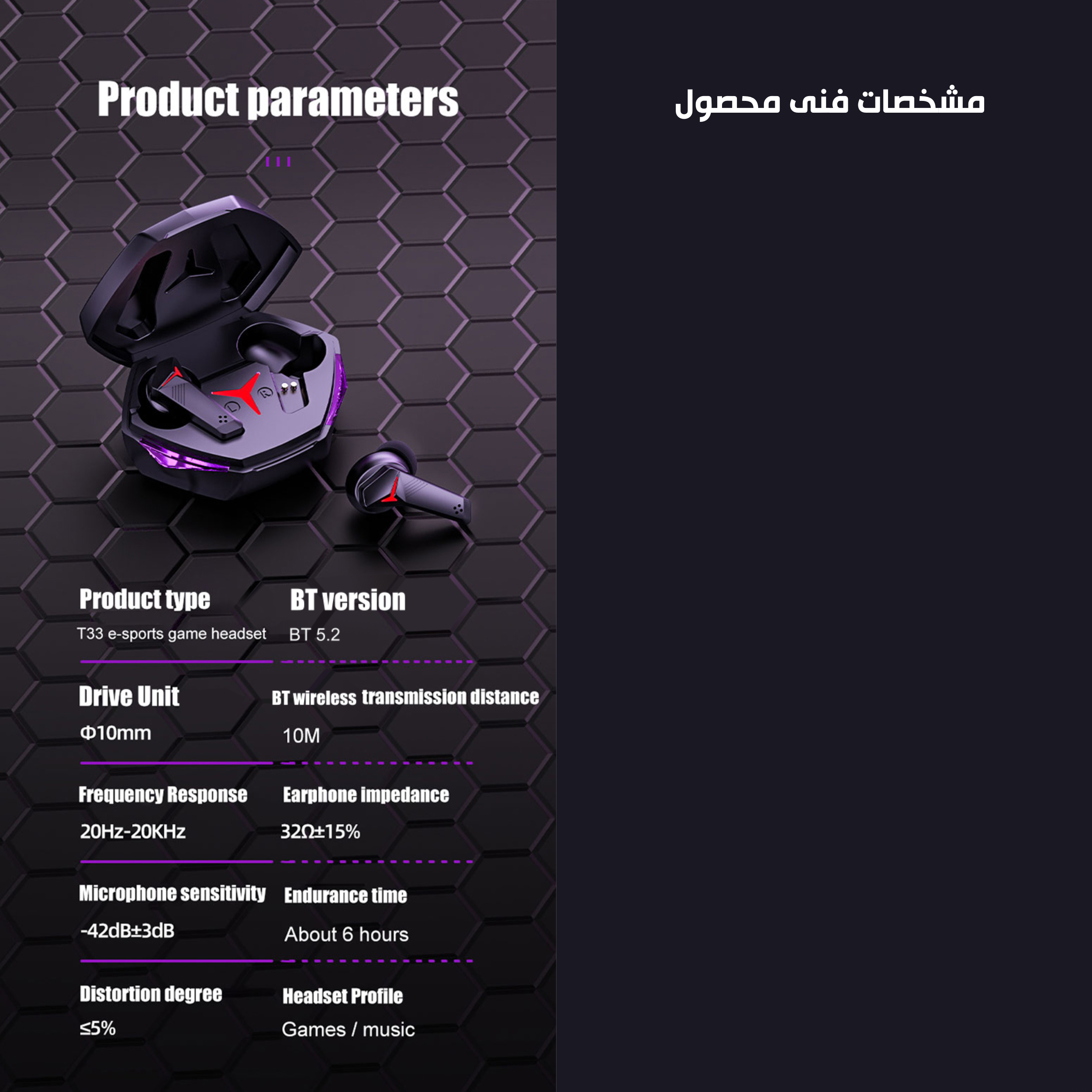 هندزفری بی سیم گیمینگ T33، از سری گجت‌های خوش‌ساخت است که به خصوص برای گیمرها انتخابی عالی محسوب می‌شود. طراحی استاندارد و مطابق با ارگونومی گوشی‌های هدفون مدل T33، علاوه بر ایجاد راحتی در استفاده طولانی‌مدت، سبب شده‌ است تا جای هیچ‌گونه نگرانی در خصوص خارج شدن گوشی‌ها هنگام انجام فعالیت‌های مختلف باقی نماند. از دیگر ویژگی‌های این هدفون می‌توان به راه‌اندازی ساده و عدم تاخیر صدا اشاره کرد که سبب افزایش رضایت کاربران از این محصول شده است. کیفیت صدای مناسب دستگاه و وضوح بسیار بالای صدای در حال پخش نیز در افزایش رضایت کاربران از هدفون تاثیر به‌ سزایی داشته است. به عنوان تکمیل‌کننده قابلیت‌های این مدل می‌توان به باتری قدرتمند تعبیه شده در گوشی‌ها اشاره کرد که انرژی از دست رفته خود را در مدت زمان کوتاهی بازیابی می‌کنند. هم‌چنین این گوشی‌ها به دلیل بهره‌مندی از ظرفیت بالا می‌توانند با کمک کیس خود به مدت 6 ساعت بی وقفه و بدون نیاز به شارژ مجدد به فعالیت بپردازند. باتری ایرفون‌های T33، تقریبا حدود 6 ساعت بسته به موسیقی و حجم صدایی که گوش می‌کنید، شما را همراهی می‌کنند و به پخش موسیقی برای شما می‌پردازند. کیفیت و کارایی در عین بهره‌مندی از قابلیت‌های روز دنیای تکنولوژی سبب شده است تا این هندزفری در نظر کاربران بسیار محبوب واقع شود و بتواند فروش خوبی را رقم بزند. هندزفری بی سیم T33 با استفاده از بلوتوث و در کوتاه‌ترین زمان ممکن به دستگاه موردنظر شما متصل می‌شود و تا فاصله 10 متری از دستگاه متصل، می‌تواند عملکرد بدون نقصی را ارائه دهد.