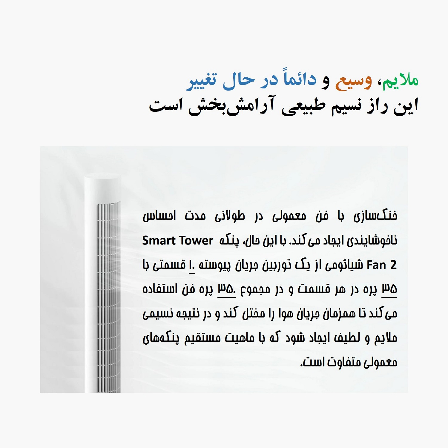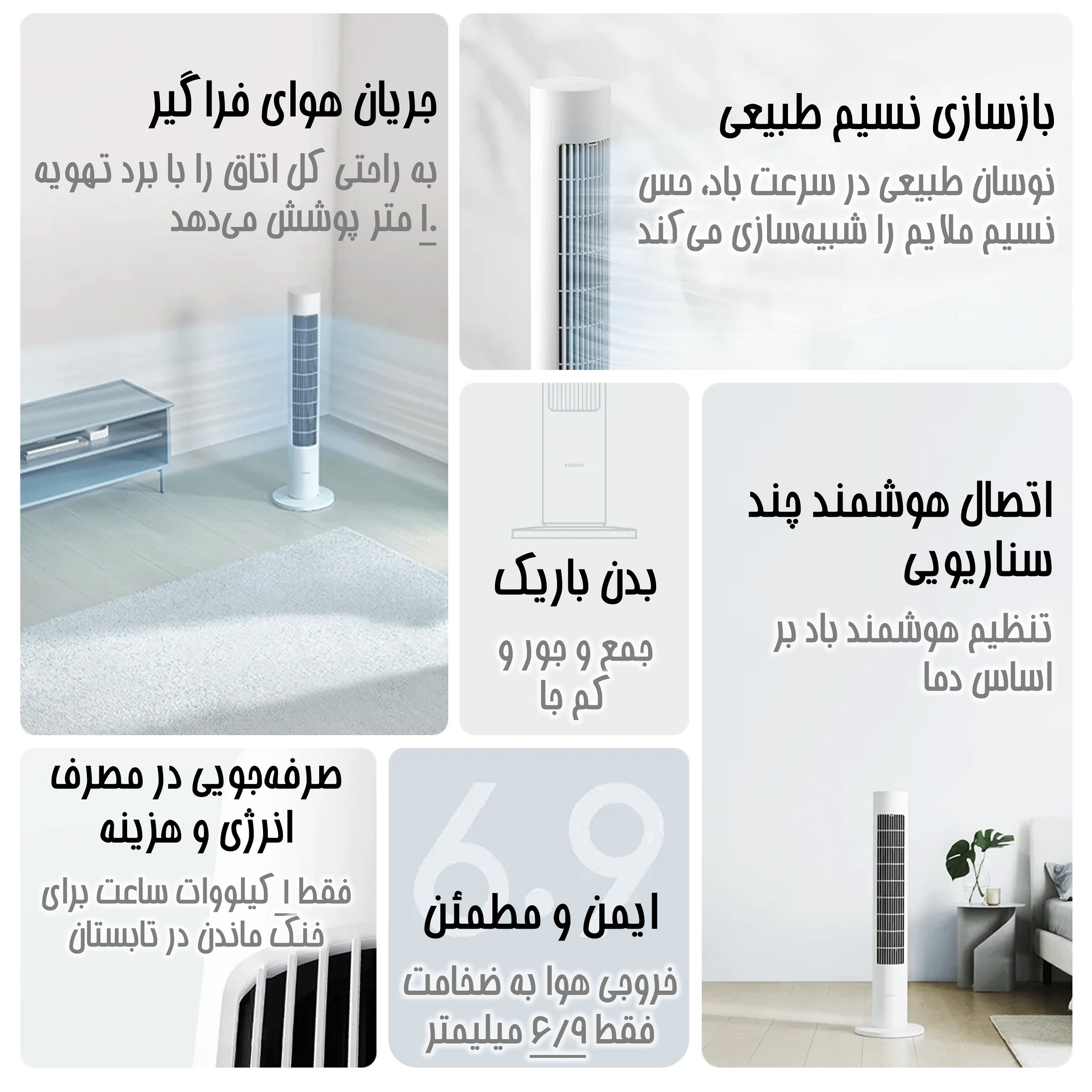 - سایر توضیحاتتوان: 24 وات | صدا: دور کند: 28.7dB(A) / دور تند: 59.7dB(A) | محدوده زاویه پرتاب باد: افقی: قابل انتحاب در بازه های ۳۰، ۶۰، ۹۰، ۱۲۰ و ۱۴۰ درجه | برد پرتاب باد: تا 10 متر | حداکثر جریان هوا: 494 متر مکعب در ساعت | قابلیت کنترل صوتی هوشمند از طریق Xiao Ai، الکسا و گوگل | قابلیت اتصال به و کنترل با برنامه کاربردی MiHome | قابلیت های تنظیم سرعت: از ۱ تا ۱۰۰ از طریق برنامه کاربردی. از ۱ تا ۴ از روی پنکه (تنظیم ۱ روی پنکه معادل سطح سرعت ۱ در برنامه است. تنظیم عدد ۲ روی پنکه معادل سطح سرعت ۳۵ در برنامه است. تنظیم عدد ۳ روی پنکه معادل سطح سرعت ۷۰ در برنامه است. تنظیم عدد ۴ روی پنکه معادل سطح سرعت ۱۰۰ در برنامه است) | قابلیت اتصال مستقیم به دستگاههای دارای قابلیت Wi-Fi مجهز به حسگرهای دما و رطوبت، مانند تصفیهکننده هوا و تهویه مطبوع شیائومی