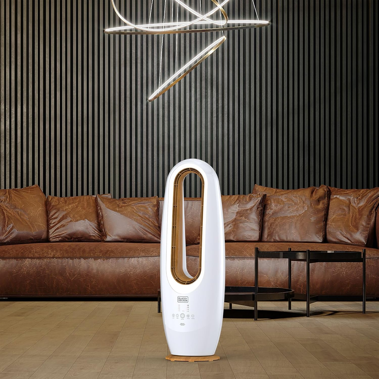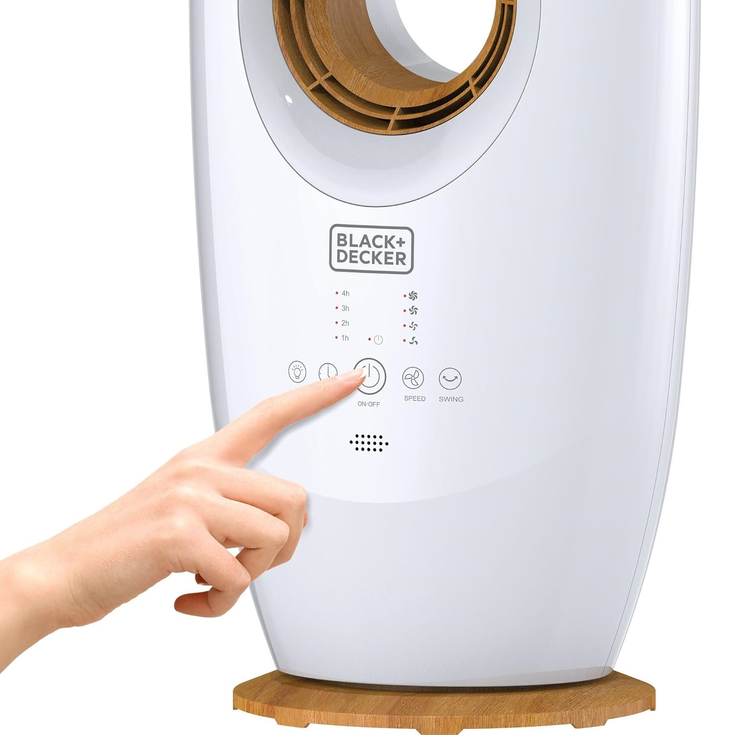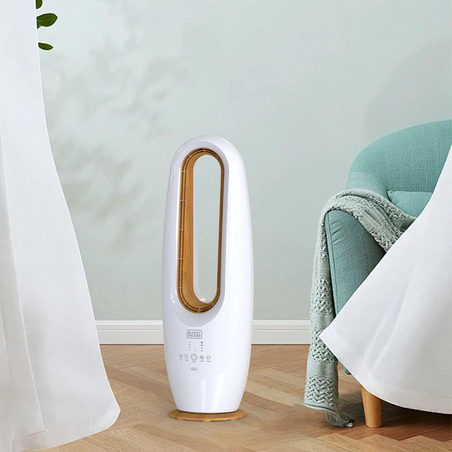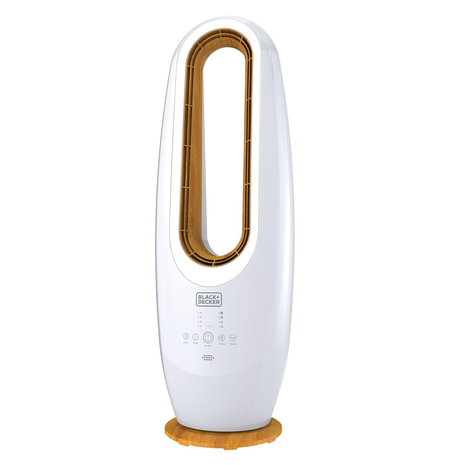 نوع عملکرد ایستاده، توان مصرفی 70وات، جنس بدنه پلاستیک، طراحی ظریف چوب در قسمت پایه و مرکز فن، نوع کلید لمسی، ریموت کنترل ، تعداد تنظیمات سرعت 4 سرعته، دارای لامپ LED محیطی، مجهز به تایمر 1 الی 10 ساعت، میزان صدا کمتر از 65 دسی بل بیانگر نویز کم، دارای طراحی بدون پره برای ایمنی و سبک، امکان نوسان 60 درجه برای خنک سازی گسترده