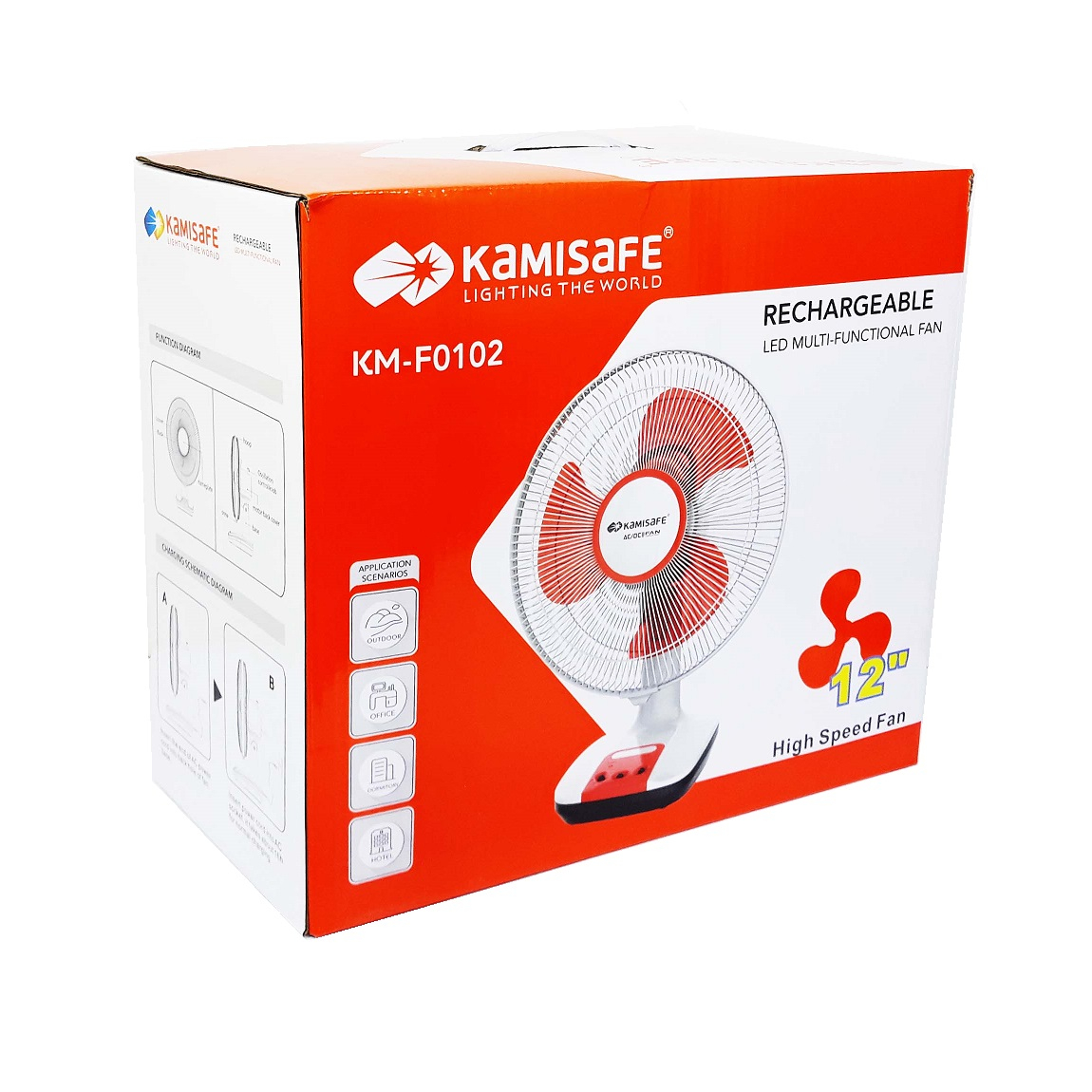 پنکه رومیزی برقی و شارژی کامیسیف Kamisafe مدل KM-F0102 پنکه ای است که می توان برای استفاده در منزل و دفتر کار و سفر و حتی داخل خودرو از آن استفاده کرد و علت نیز منبع تغذیه دوگانه آن یعنی برق و باتری شارژی بسیار قوی آن است.بدلیل قرار گرفتن باتری شارژی 6 ولت 4.5 آمپر ساعت در پایه دستگاه تعادل و استحکام آن در ایستادن در محل استقرار بسیار بالا است.در شرایط بی برقی و یا در شرایطی که فاصله با پریز برق زیاد است لزوم استفاده از این دستگاه بیشتر احساس می شود . این دستگاه مانند تمام پنکه های رومیزی برقی با یک ضامن در قسمت پشت آن و در بالای موتور الکتریکی ، قابلیت چرخش به چپ و راست و یا تثبیت در یک وضعیت را دارد .سرعت فن 3 درجه دارد که بدلیل باتری بسیار قوی دستگاه ، پنکه در حالت دور کم بیش از 6 ساعت و در حالت سرعت زیاد ، حدود 2 ساعت می تواند کار کند.دستگاه را می توانید هم با سیم دوشاخه دستگاه شارژ کنید که زمان شارژ کامل آن با برق شهر 16 ساعت است و همچنین با آداپتور 12 ولت شارژ می شود( که به همراه دستگاه نیست ) . همچنین بر روی پایه دستگاه چراغ اضطراری با تعدادی ال ای دی SMD وجود دارد.