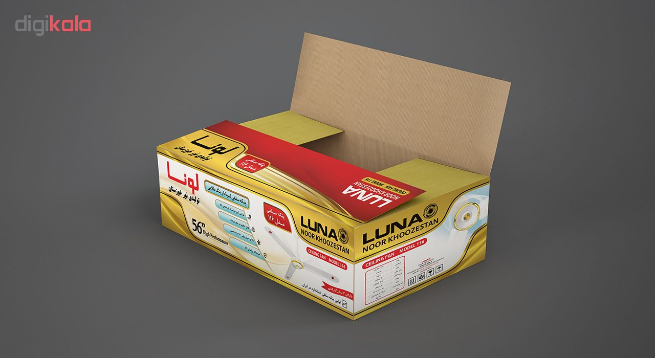 پنکه سقفی «لونا» مدل «116» یکی از زیباترین محصولات شرکت لونا است که با طراحی شیک و استفاده از رینگ طلایی بر روی بدنه موتور بر زیبایی هرچه بیشتر این مدل افزوده است. موتور قدرتمند با توان 90 وات و کیفیت و استحکام بالا از دیگر شاخصه های این پنکه سقفی زیبا است. این پنکه قابلیت تنظیم سرعت در5 حالت را دارا است و کاربر میتواند سرعت چرخش پره ها را متناسب با فضای موجود، انتخاب نماید. تمامی پنکه های سقفی لونا دارای گواهینامه استاندارد ایمنی محصول می باشد. برند لونا در راستای پیشبرد اهداف خود که کارآفرینی و توجه نمودن به رضایت و نیاز مشتری است سعی بر تولید محصولات متنوع و مرغوب را دارد. نوآوری، طراحی زیبا و ارائه محصول با کیفیت از نکات بارز در محصولات لونا است.