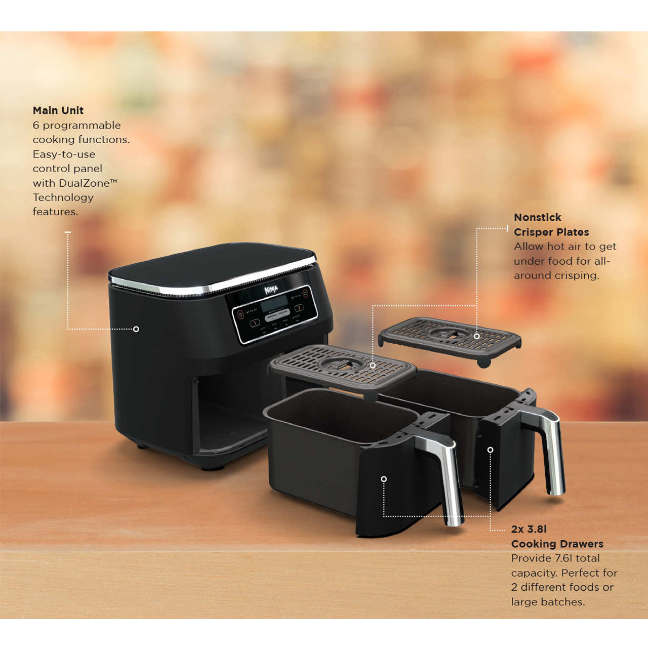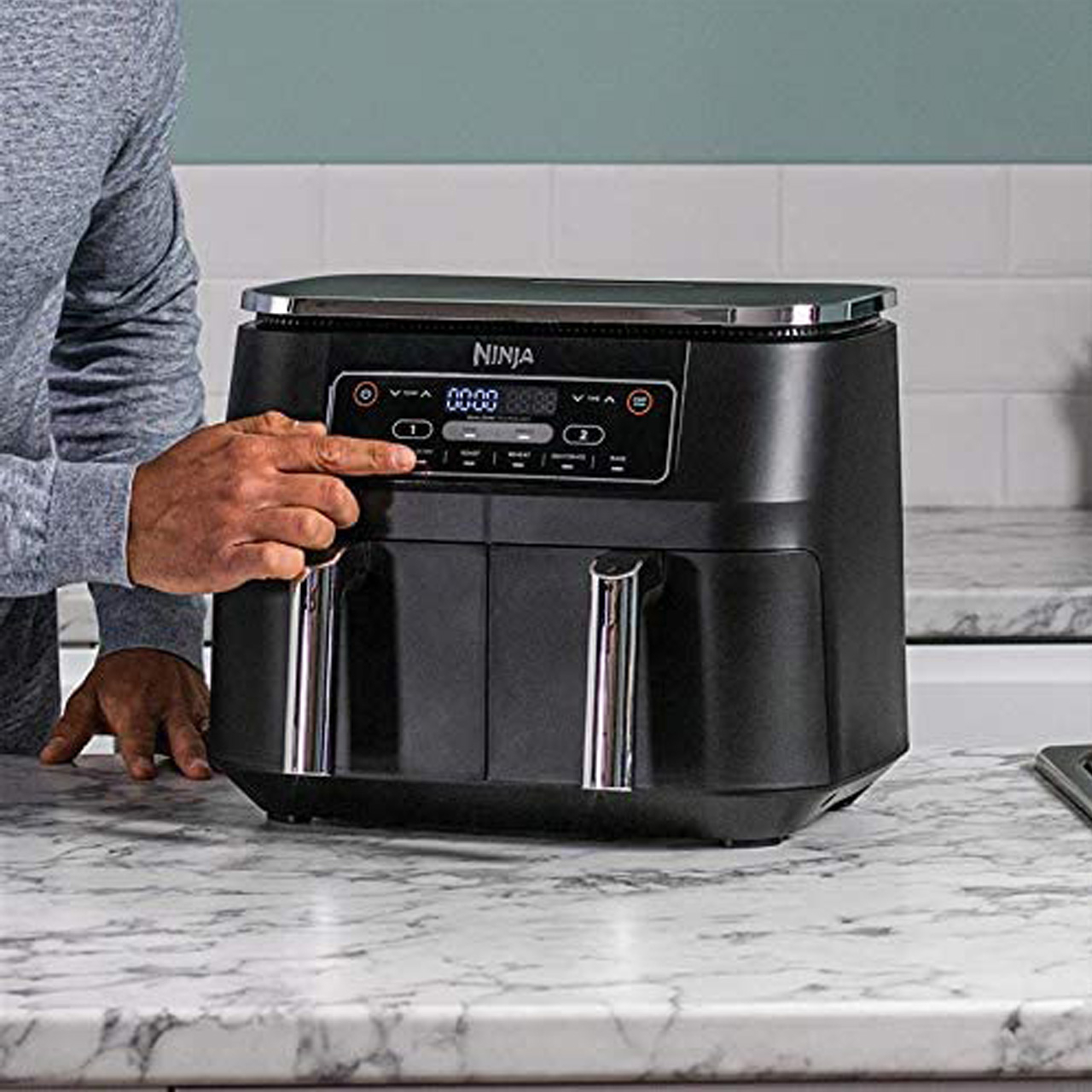 - سایر توضیحاتمحدوده دما 40 درجه سانتیگراد تا 240 درجه سانتیگراد برنامه های پخت : Max Crisp , Air Fry , Air Roast , Bake , Reheat , Dehydrate ( کاملا ترد ، سرخ کن ، کباب کردن ، پختن (کیک و شیرینی و ...) ، گرم کردن مجدد و خشک کن میوه و سبزیجات ) فناوری منحصر به فرد DUAL ZONE ™ نینجا به شما امکان می دهد آشپزی خود را با برنامه Match or Sync همگام سازی کنید. دارای 2 سبد پخت مستقل 3.8 لیتری ، تا 1.8 کیلوگرم سیب زمینی سرخ شده یا بال مرغ را همزمان بپزید تمام اقلام عاری از BPA دارای پایه بدون لغزش قابلیت شستشو اجزاء در ماشین ظرفشویی