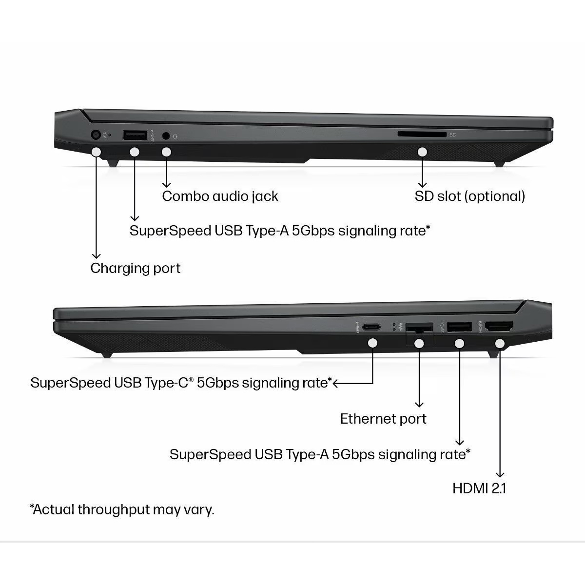 لپتاپ گیمینگ میانرده اچپی به درگاههای مختلف و متنوع مجهز شده تا چه در استفاده معمول و چه در استفاده حرفهای کمبودی را حس نکنید. در این دستگاه دو عدد پورت USB-A 3.2 همراه با یک عدد پورت USB-C مجهز به انتقال تصویر DisplayPort 1.4 تعبیه شده است. این سه درگاه همگی از سرعت انتقال پنج گیگابیت بر ثانیه و فناوری HP Sleep and Charge نیز بهرهمند هستند. اچپی درگاههای دیگری همچون خروجی ویدیوی HDMI 2.1، درگاه شبکه، شیار کارت حافظه و جک ۳.۵ میلیمتری صدا را هم برای آن در نظر گرفته تا Victus 15 fb2686nw تا دندان مسلح باشد.