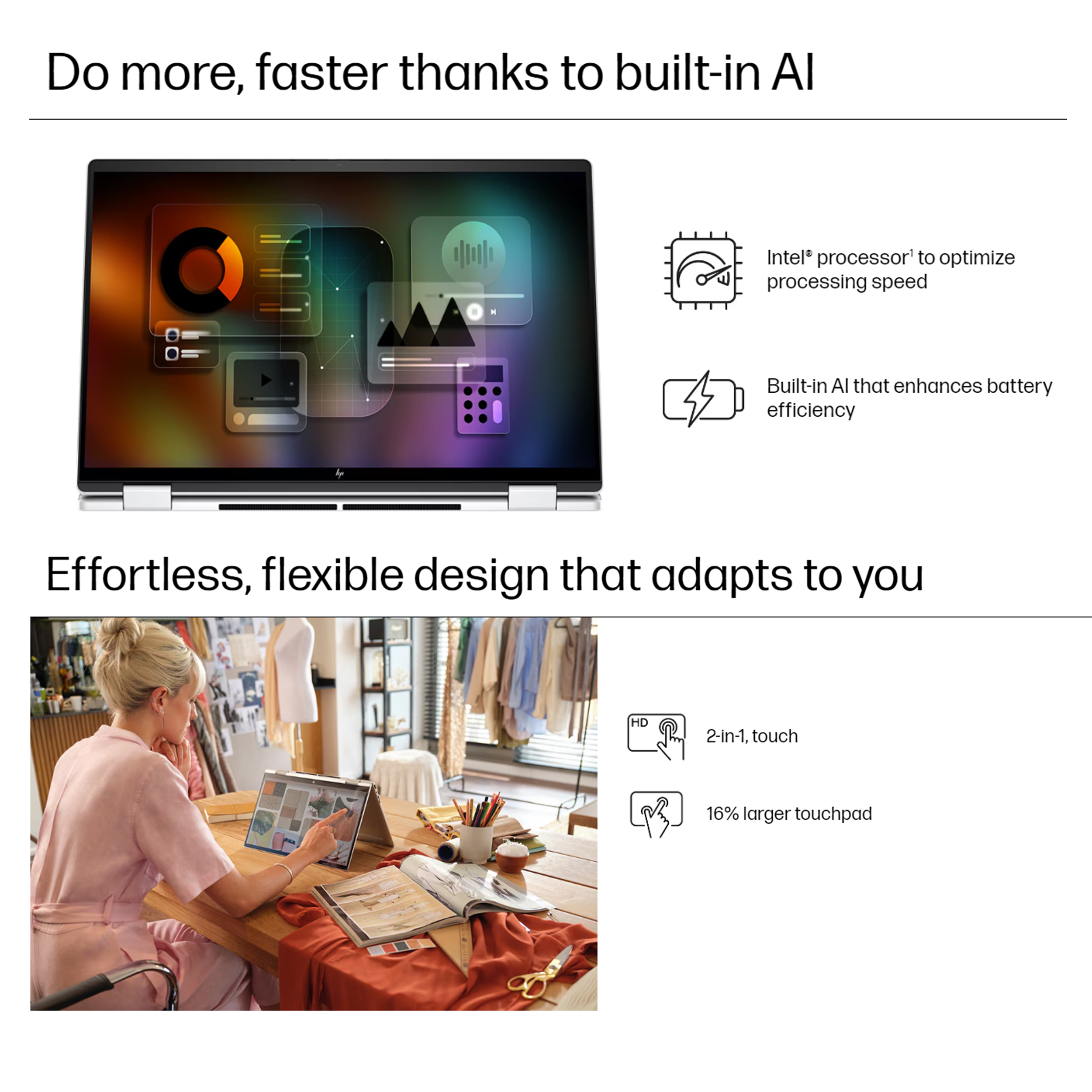 - امکانات دیگرچیپست Intel integrated SoC / دارای تراشه و واحد پردازشی مجزا Intel NPU برای رشته های عصبی هوش مصنوعی / استاندارد مصرف انرژی EPEAT Gold with Climate+ / بدنه تمام آلمینیومی برای سبکی و خروج بهتر حرارت از داخل دستگاه / کلید HP Programmable key روی کیبورد با امکان شخصیسازی / پشتیبانی کامل از Tablet Mode ویندوز 11 / دارای برنامه Intel Unison مخصوص سری لپتاپهای با پردازنده های نسل 13 به بالا و با امکان هماهنگسازی گوشیهای هوشمند / دارای پورت HDMI 2.1 / دارای کلید Copilot روی کیبورد جهت دسترسی مستقیم به برنامه برای بهرهمندی از امکانات هوش مصنوعی ویندوز 11