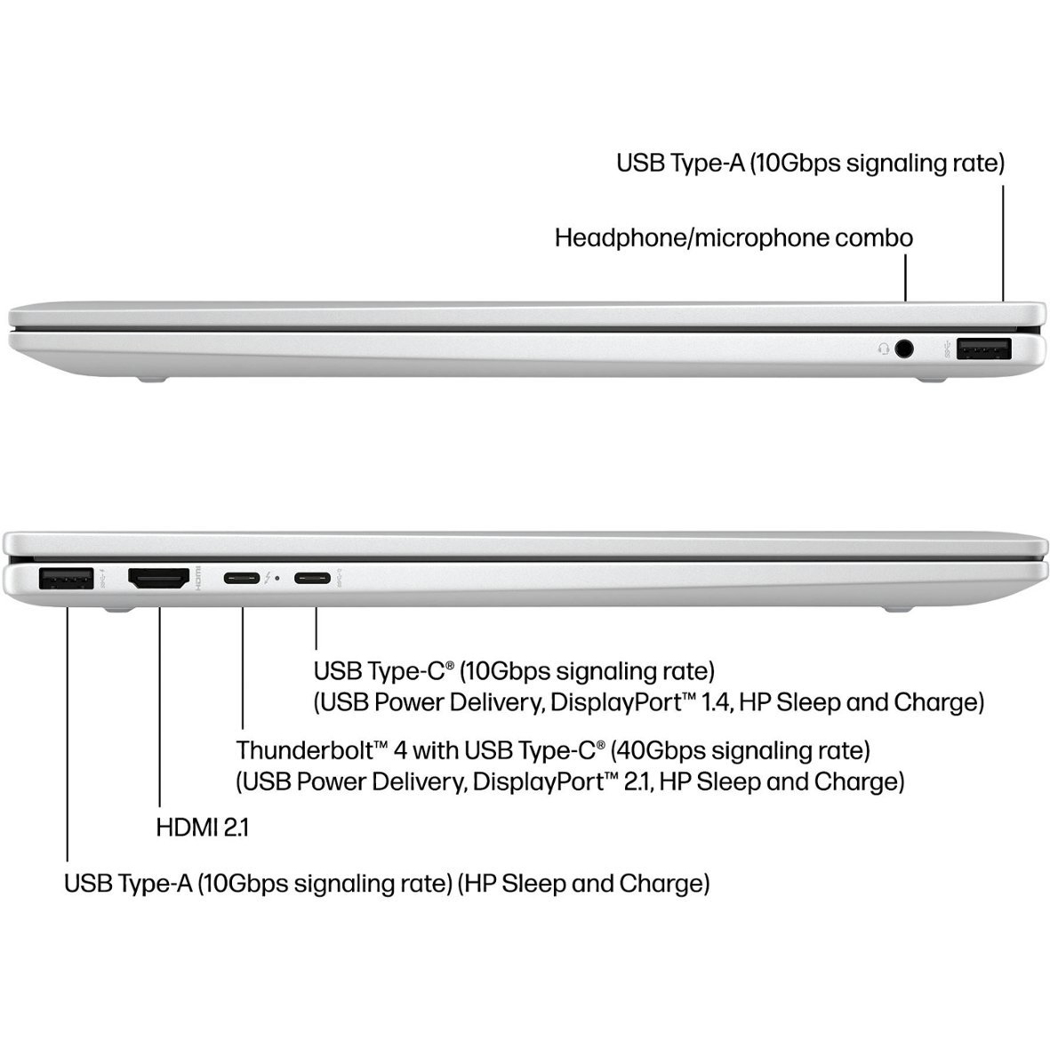 - تعداد پورت USB Type-Cدو عدد (یک عدد با سرعت 10 گیگابیت بر ثانیه با پشتیبانی از شارژ و DisplayPort 1.4 و HP Sleep and Charge - یک عدد Thunderbolt 4 با پشتیبانی از شارژ و DisplayPort 2.1 و HP Sleep and Charge)