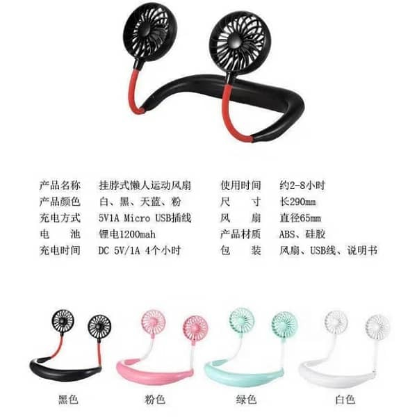 از خنک کننده جریان هوا و بدون نگه داشتن دست لذت ببرید . با توجه به طراحی نیازی به استفاده از دست نمیباشد و فقط آن را بر روی گردن خود بگذارید و همچنین شما می توانید کارهای دیگر را همزمان انجام دهید . دارای سرعت باد کم / متوسط / قوی قابل تنظیم ، همچنین می توانید زاویه های باد مناسب را برای رفع نیاز خود تنظیم کنید . باتری قابل شارژ 1200mAh میباشد و می تواند توسط دستگاههای 5 ولت خروجی ، در 2 ساعت شارژ کامل شارژ شود . ایده آل برای خنک شدن در محل های فضای باز ، کمپینگ ، پیک نیک ، مسابقات ورزشی ، سفر ، کنسرت و غیره . نه تنها قابل استفاده در گردن ، بلکه می تواند روی میز نیز استفاده شود. به اندازه کافی کوچک برای قرار دادن در کیف یا جیب . توجه کنید اگر یکی از پره ها نمی چرخید کافی است با فشار دادن پلاستیک داخل آن چرخش مجدد ایجاد شود و گاهی اوقات اتصال بین پره های سفید رنگ داخل محفظه با آلمیچر ممکن است شل شده باشد.