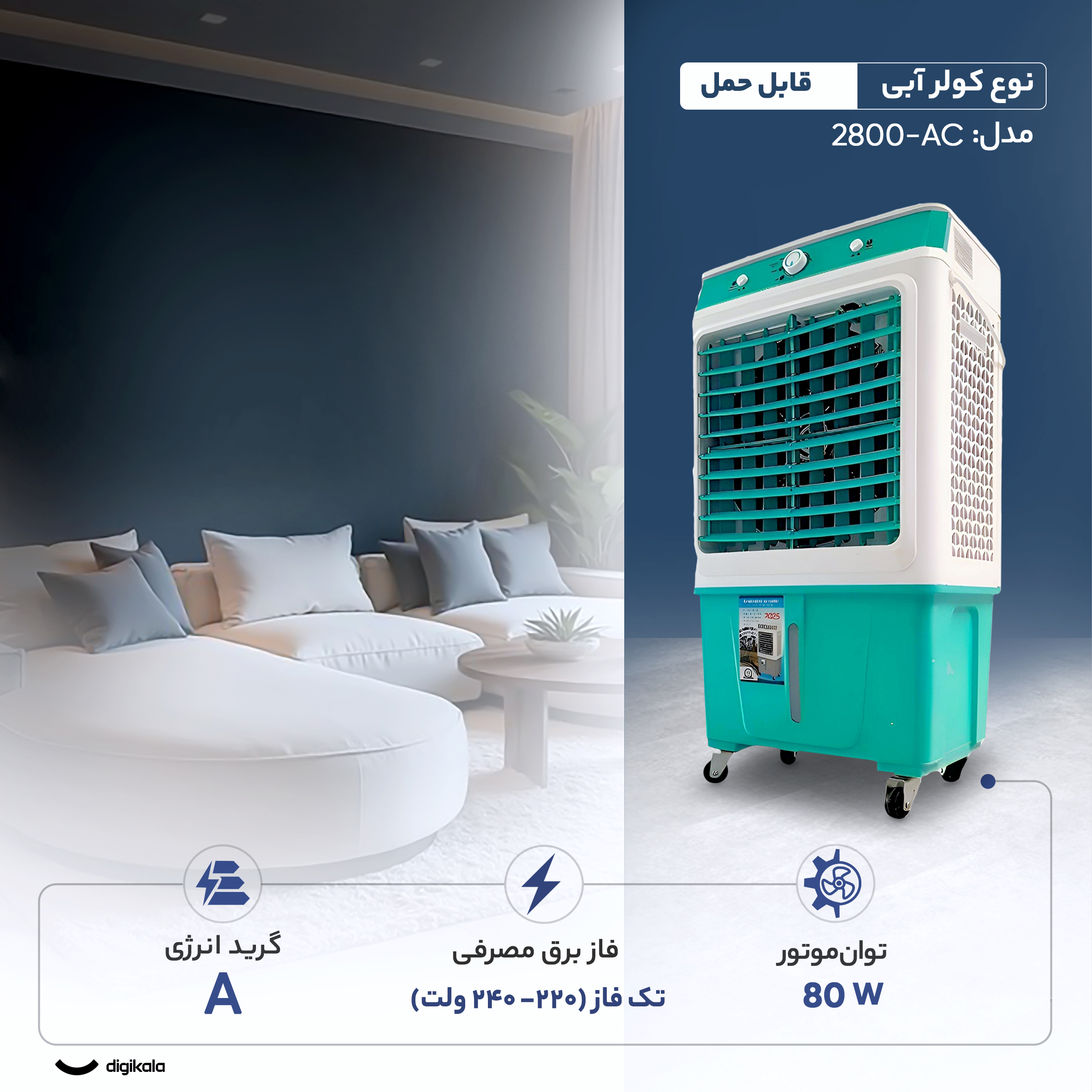 کولر AC-2800 با ظرفیت خنککنندگی ۲۸۰۰ CFM برای فضاهای ۳۰ تا ۵۰ متر مربع طراحی شده است. این دستگاه از پدهای سلولزی بهره میبرد که نسبت به پوشالهای قدیمی، راندمان بهتری در جذب و نگهداری آب دارند و در نتیجه خنککنندگی بیشتری ایجاد میکنند. بازده خنکی این کولر تا ۶۵ درصد اعلام شده که برای یک کولر قابلحمل در این ابعاد، میزان قابل توجهی است. همچنین همراه دستگاه دو جایخی ارائه شده تا در روزهای گرمتر، کاربر با افزودن یخ به محفظه مربوطه، هوایی خنکتر و مطبوعتر دریافت کند. این کولر با توان مصرفی تنها ۸۰ وات و جریان ۰.۶ آمپر، از نظر مصرف انرژی در رده محصولات بهینه قرار دارد. ولتاژ ورودی آن ۲۲۰ ولت بوده و با برق شهری تک فاز بهراحتی کار میکند. گرید انرژی A نشاندهنده راندمان بالای دستگاه و صرفهجویی در هزینههای برق در استفاده طولانیمدت است. پروانه پلاستیکی دستگاه نیز علاوه بر وزن سبک، صدای کمتری تولید کرده و عملکردی نرمتر نسبت به پروانههای فلزی دارد.